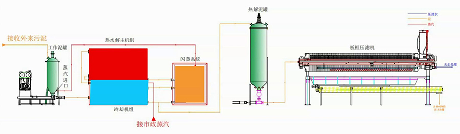 用連續(xù)加壓加溫的方法,添加少量催化劑,加速污泥中的有機物分解,使污泥中的“結(jié)合水”、“間隙水”轉(zhuǎn)化為“自由水” ,并通過機械壓濾的方式,達到含水率<30%效果。